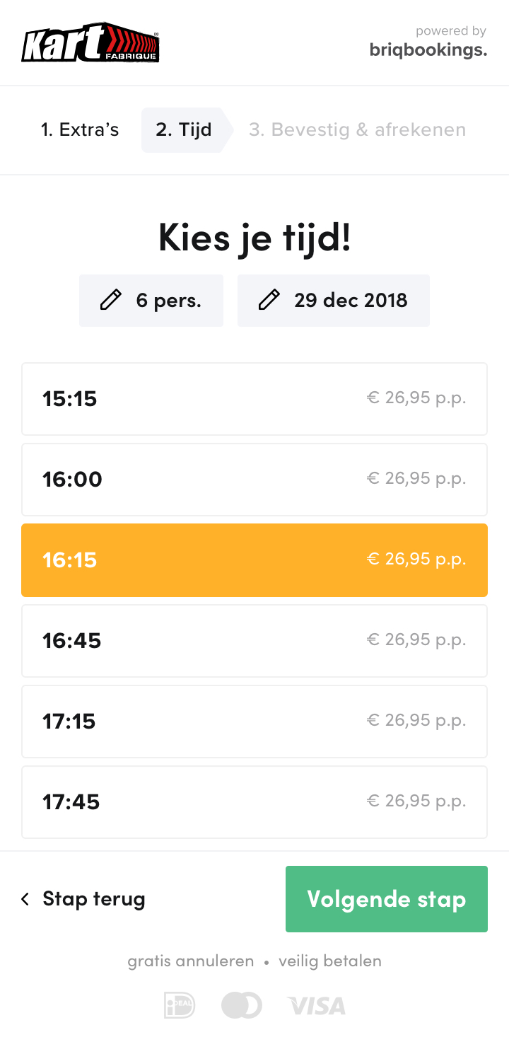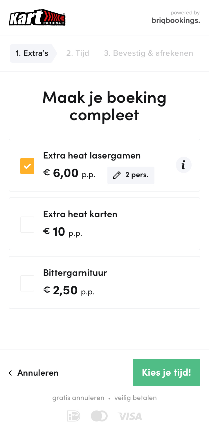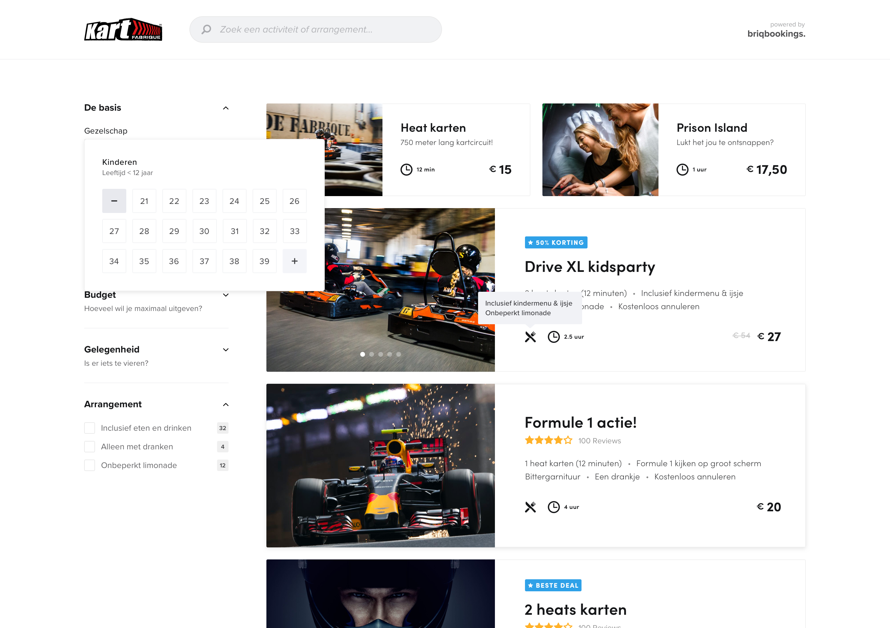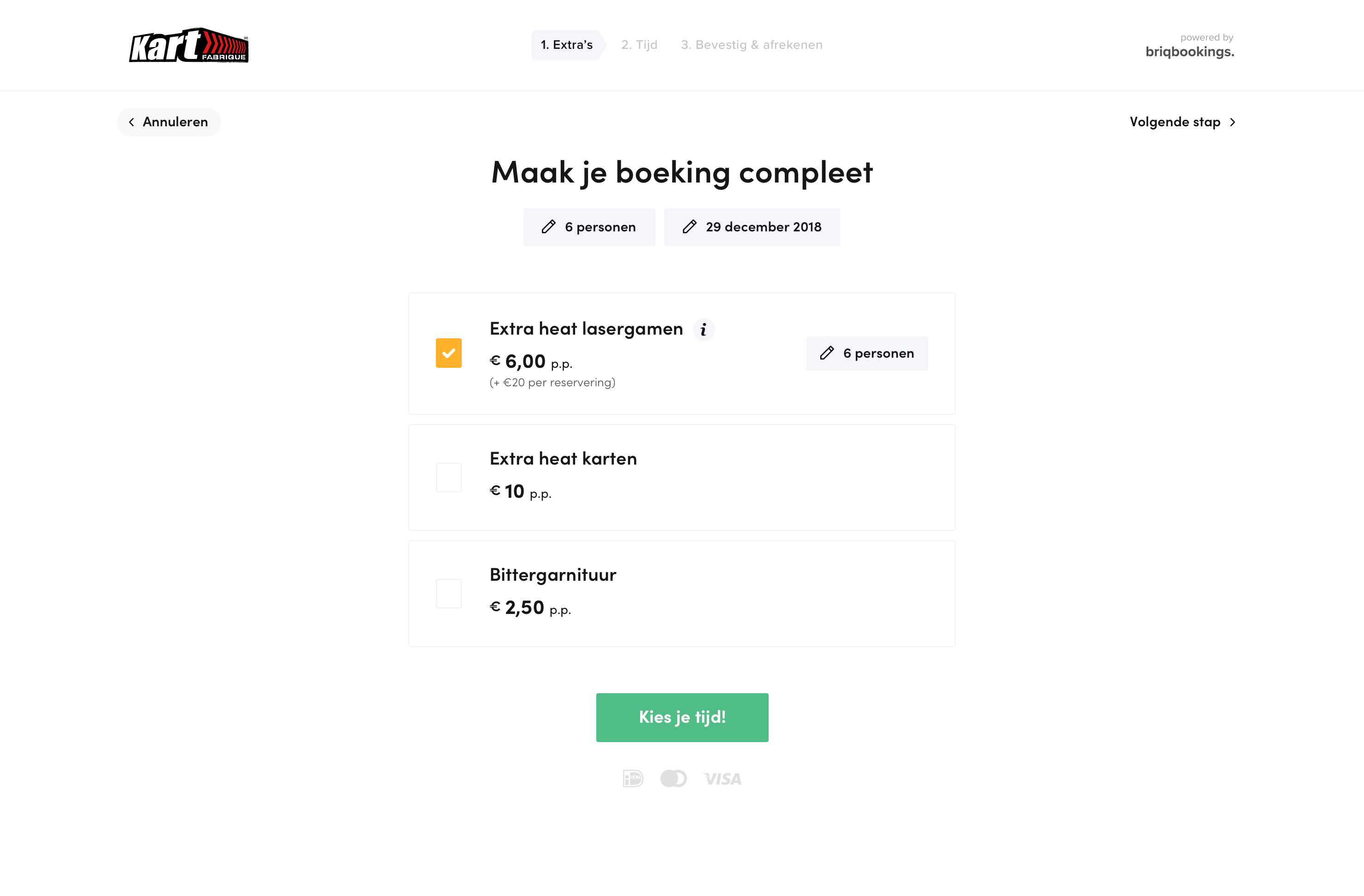 Waar "App" het hart van Briq is, is "Shop" het gezicht van Briq. In Briq Shop heeft de eindgebruiker de volledige controle over zijn boeking. De gebruiker kiest eenvoudig een starttijd van de activiteiten en vult de boeking aan met relevante extra's.