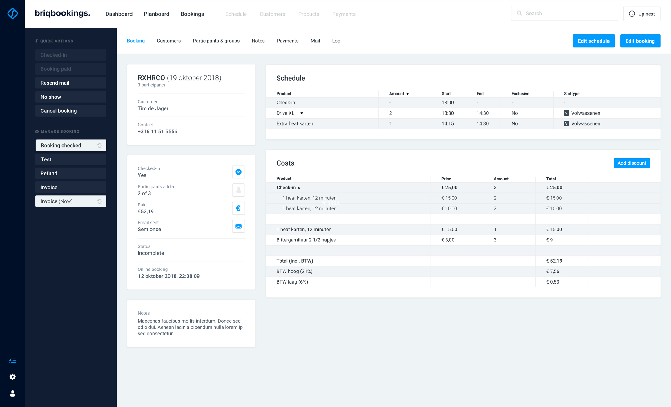 Het hart van Briq, Briq App. In tientallen sprints ontwikkelde we Briq App, In Briq app beheer je de volledige online shop, alle boekingen, betalingen en overige configuratie.